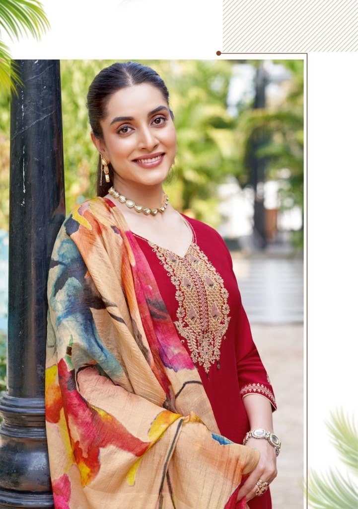 Abhilasha by Wooglee presents an elegant collection of designer readymade suits featuring premium fabric tops with intricate thread handwork on the neck, paired with stylish bottoms and beautifully coordinated dupattas. Perfect for festive occasions and traditional gatherings, this catalogue reflects grace and sophistication with its finely detailed craftsmanship and subtle color palette.