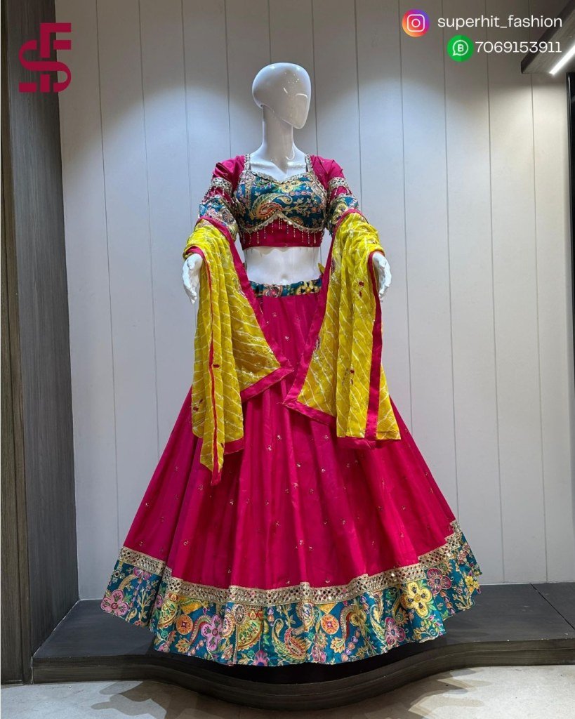 Anamika Pure Roman Silk Chaniya Choli Set with Sequin Work 10 Meter Flared Skirt with Heavy Crape Lining Vintage Work Border Padded Blouse Fancy Bo