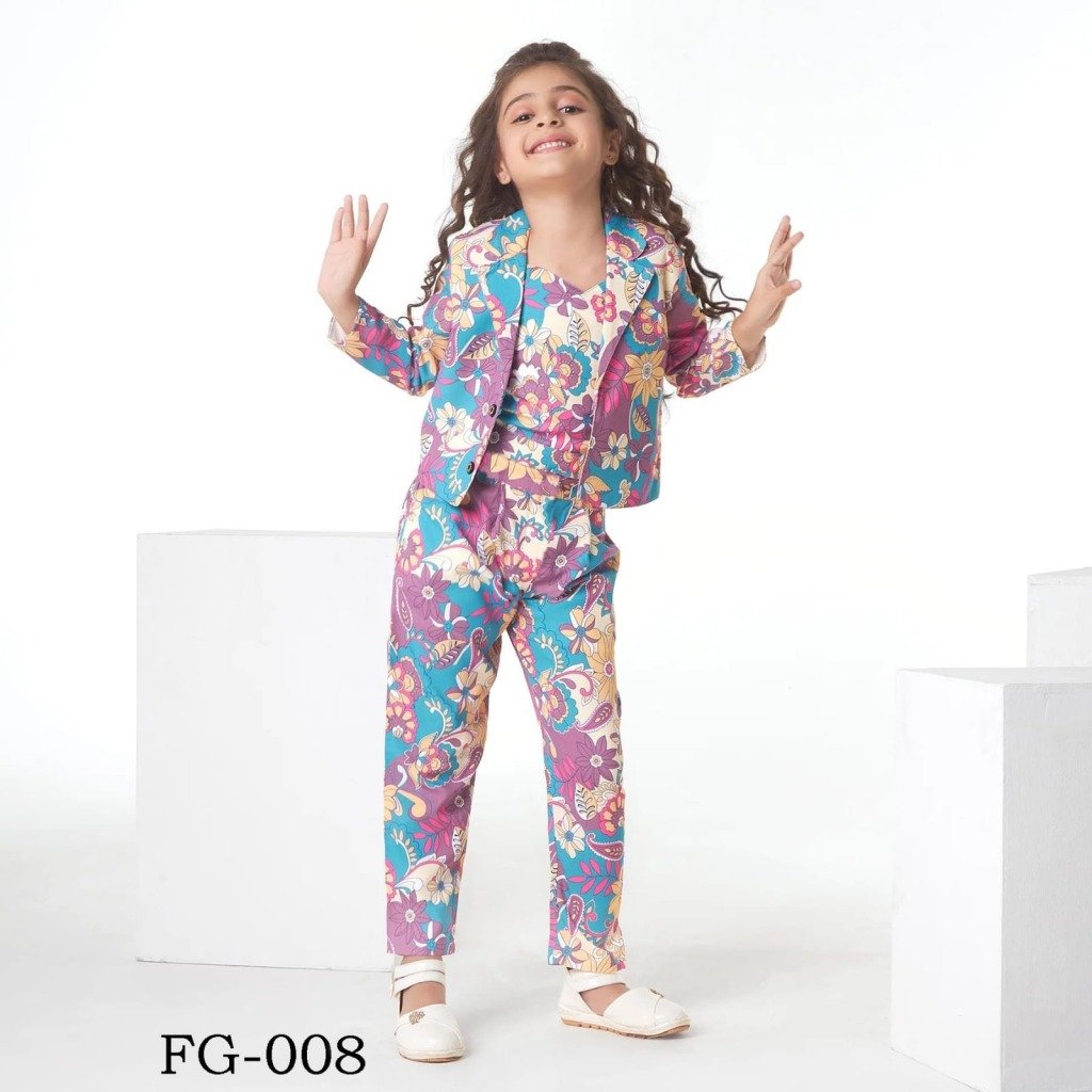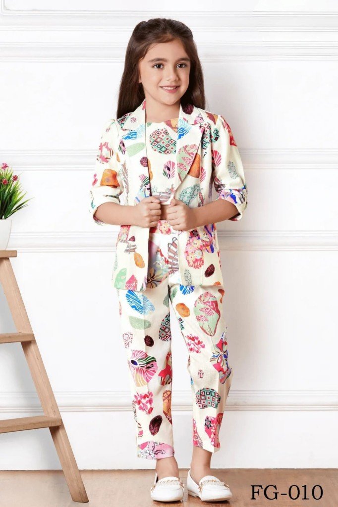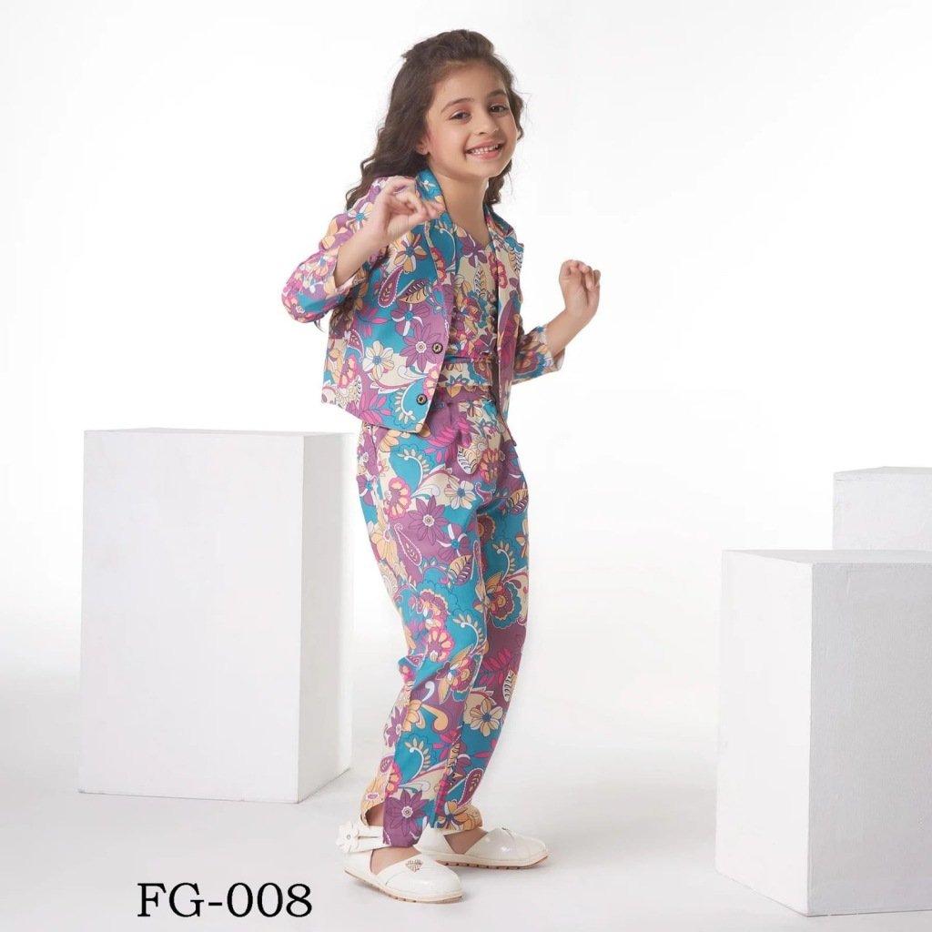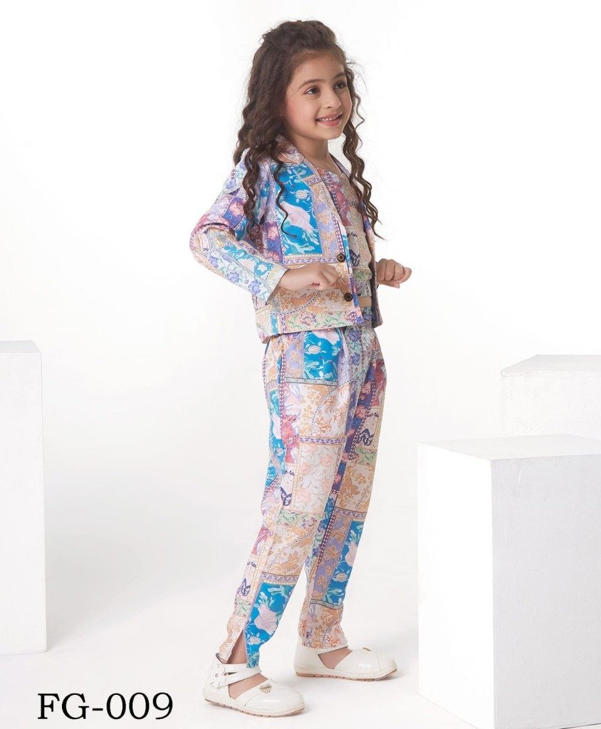 Fashion galleriya by Cute girls fancy printed cotton girls co ord set catalogue at low rate, AB Cotton (Inner Attached) blazer with AB Cotton (2 Side Pocket) pant and Digital Print.