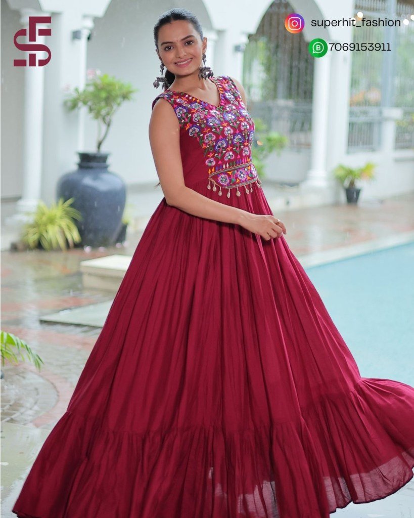 Gown love 9258 Maroon Colour Navratri Rayon Gown with Kutchi Gamthi Thread Embroidery And Mirror Work Wholesale