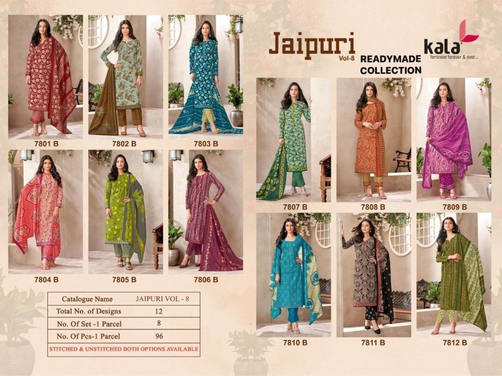Kala Jaipuri Vol 8 Pure Cotton Ready Made Salwar Kameez Suit with Bottom And Dupatta Wholesale