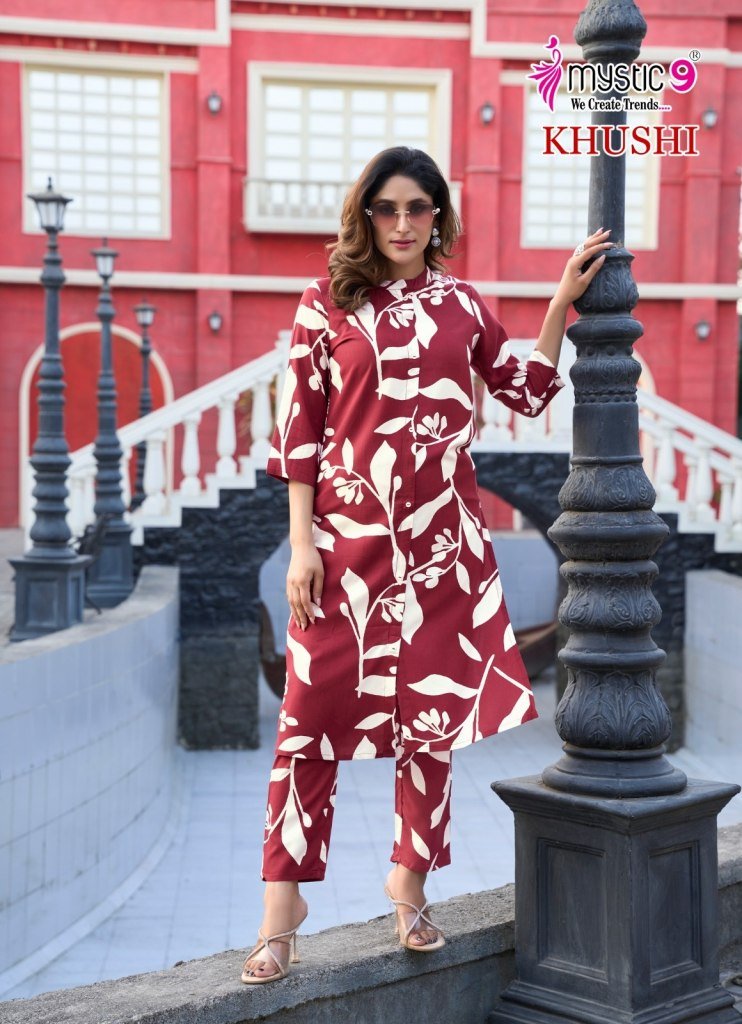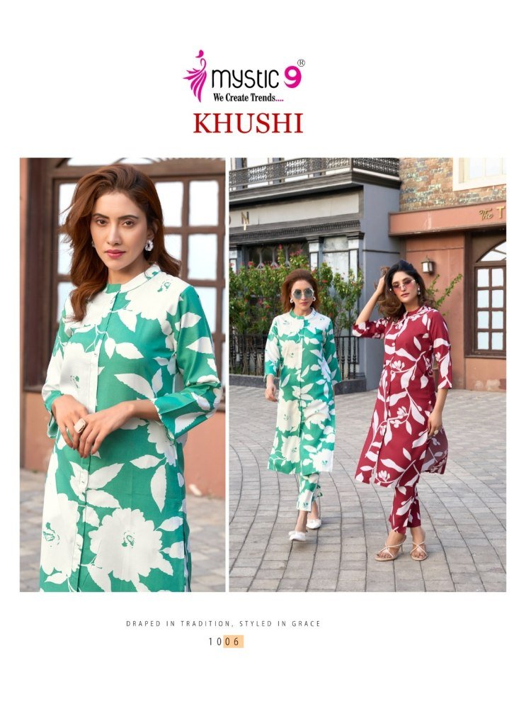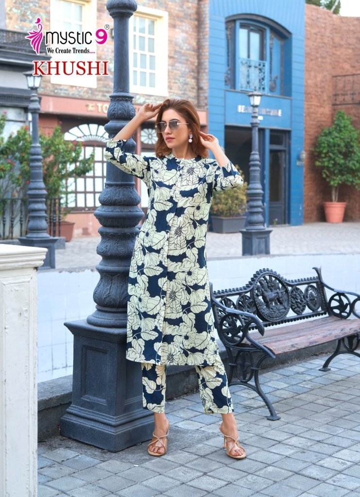Khushi Vol 1 by Mystic 9 a premium quality collection of trendy printed cotton tops with matching bottoms. Perfect everyday wear at a budget-friendly price.