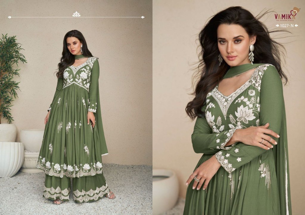 Lakhnavi Vol 5 by Vamika – a stunning collection of heavy Reyon thread embroidered flared tops with palazzo suits. Shop this elegant ethnic wear catalogue at an affordable rate for a stylish and graceful look.