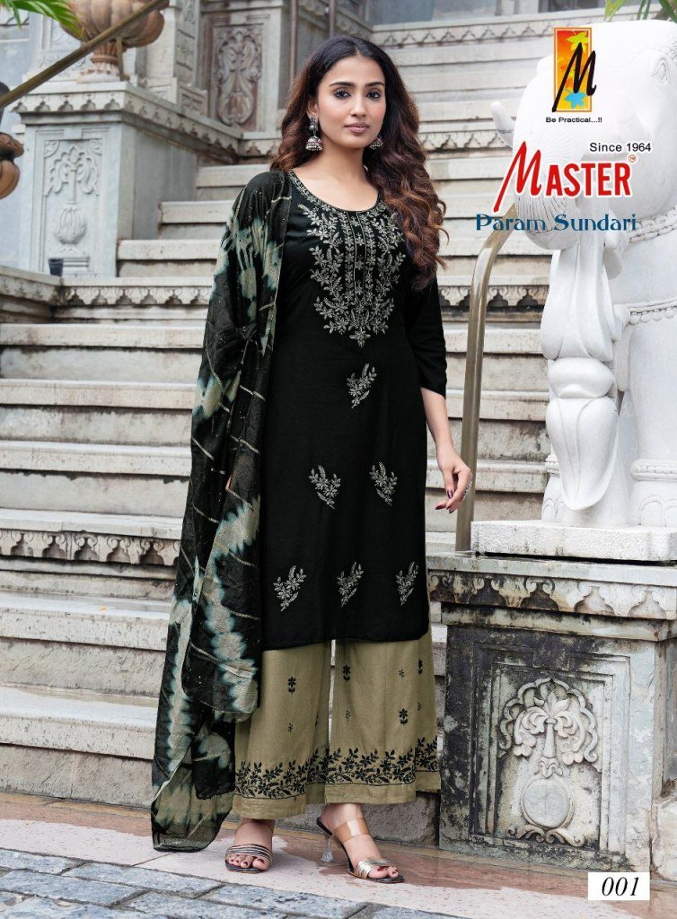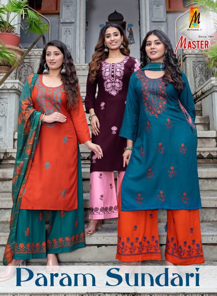 Master Param Sundari Rayon Kurti Catalogs Top And Plazo Set with Nazmine Dupatta Wholesale