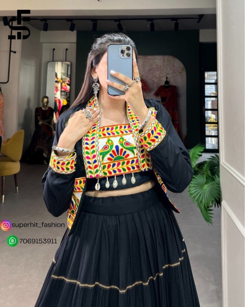 Navratri Special Jhamkudi Lehenga Choli 1606 Black Colour Pure Rayon with Gota Patti Shine And Gamthi Work with Cowrie Lace blouse With Jocket Wholes
