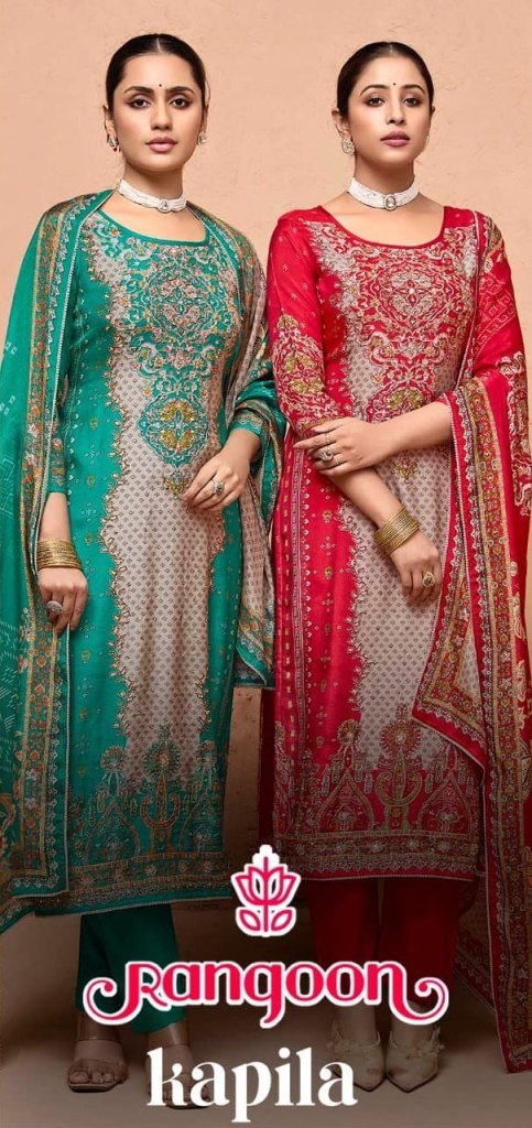 Rangoon Kapila Pure Muslin Digital Print Suit with Aari And Swarovski Diamond Work Viscose Inner Bottom And Lace Border Dupatta Wholesale