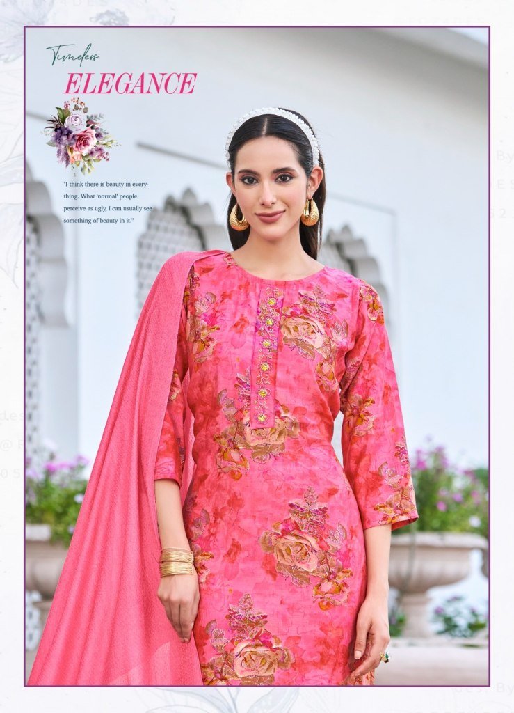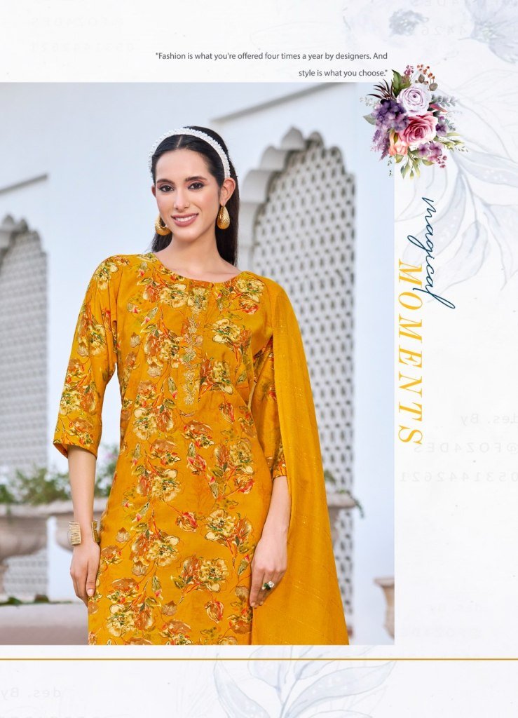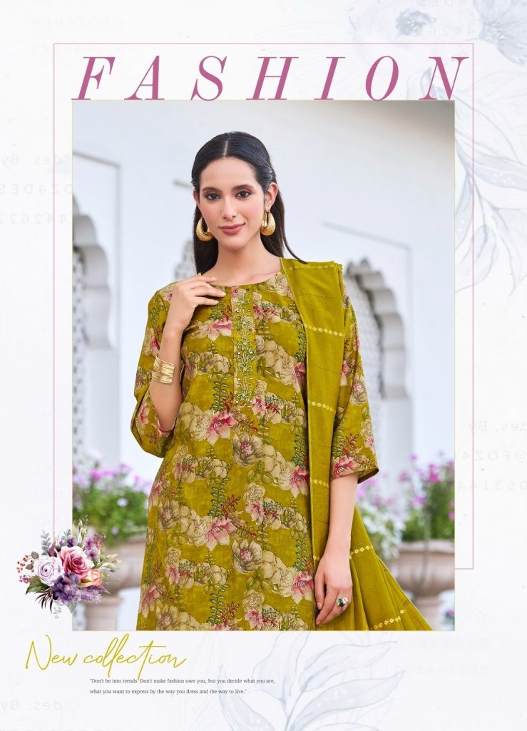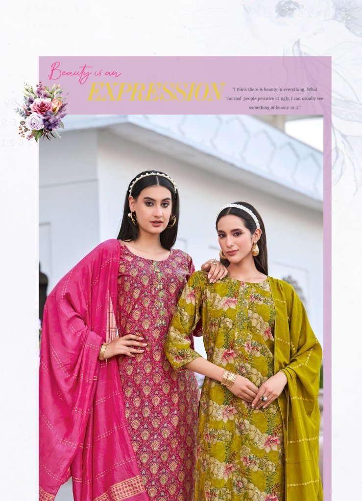 Satrangi Vol 8 by Radhika Lifestyle. Crafted from premium Modal Chanderi fabric, this beautiful collection features intricate handwork detailing over rich digital prints, offering a perfect blend of tradition and trend. These readymade suits are designed for effortless style and comfort, making them ideal for festive occasions, casual gatherings, or office wear.
