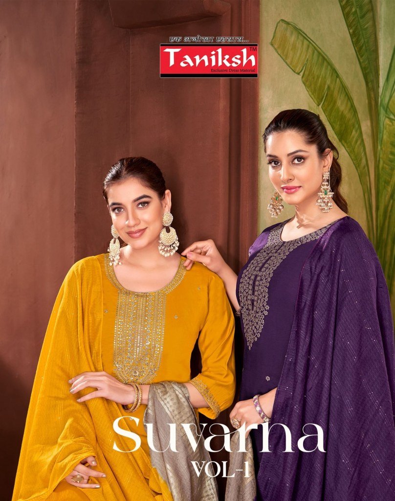 Suvarna Vol 1 by Taniksh, a beautiful fusion of elegance and comfort! This collection features fancy Roman fabric with intricate embroidery work on the kurti, paired with matching pants and a graceful dupatta. Designed for the modern woman who loves ethnic charm with a touch of trend, these readymade sets are perfect for festive occasions, casual outings, and semi-formal events. Explore premium quality at an affordable rate.