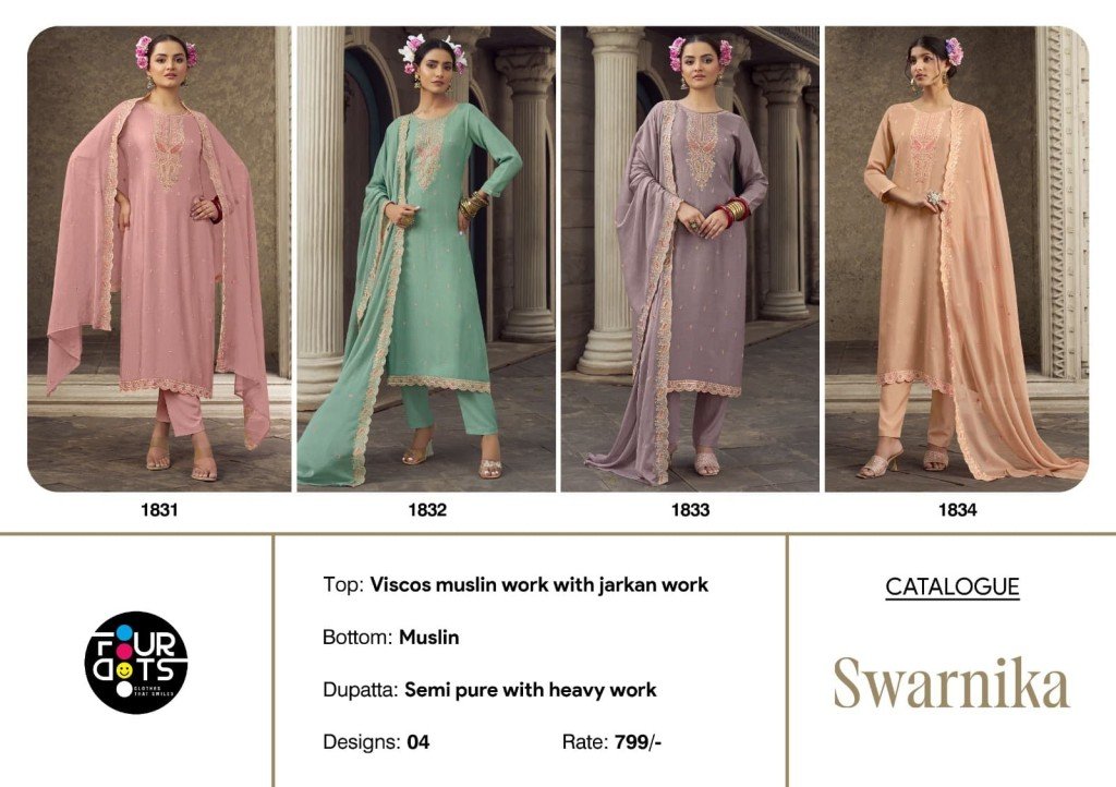 Swarnika by Fourdots – a stunning collection of unstitched suits crafted in premium viscose muslin fabric with elegant jarkan work. Ideal for festive and party wear, this catalogue offers designer ethnic wear at an affordable price. Shop now and elevate your style.