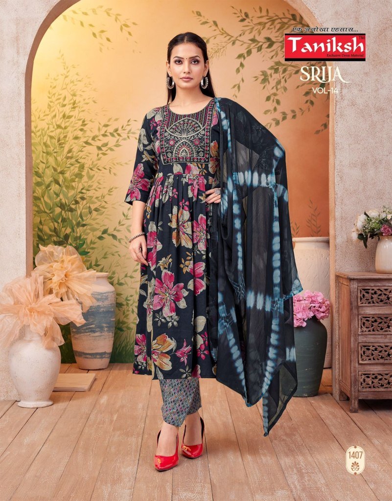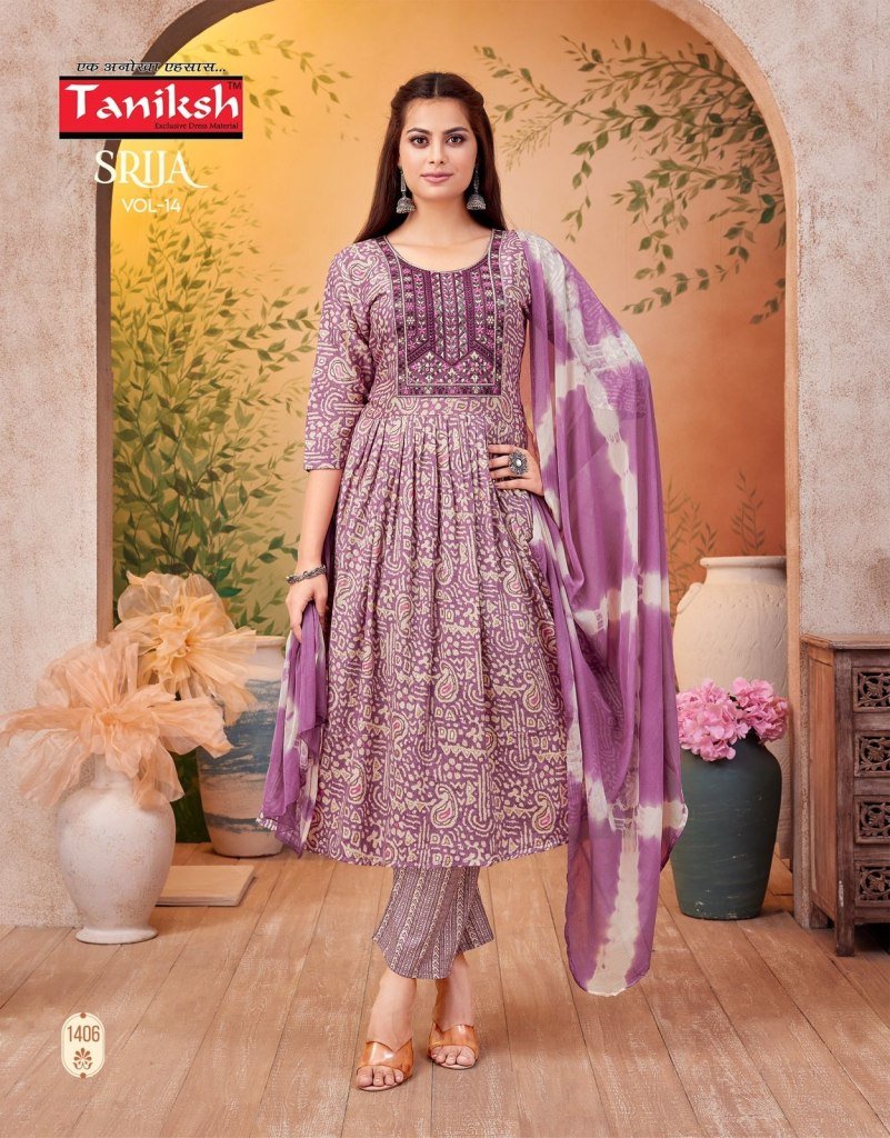 Taniksh Srija Vol 14 Anarkali Capsule Print Salwar Suit with Embroidery Print Pant and Nazmin Dupatta Wholesale