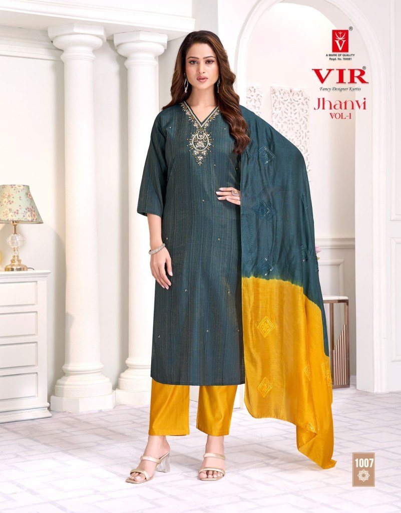 VIR Jhanvi Vol 1 Designer Suit Set Vertican Simmer Top Dentin Pant And Chanderi Dupatta Wholesale