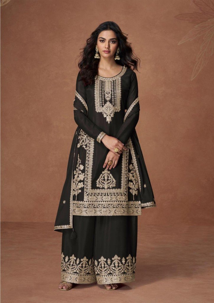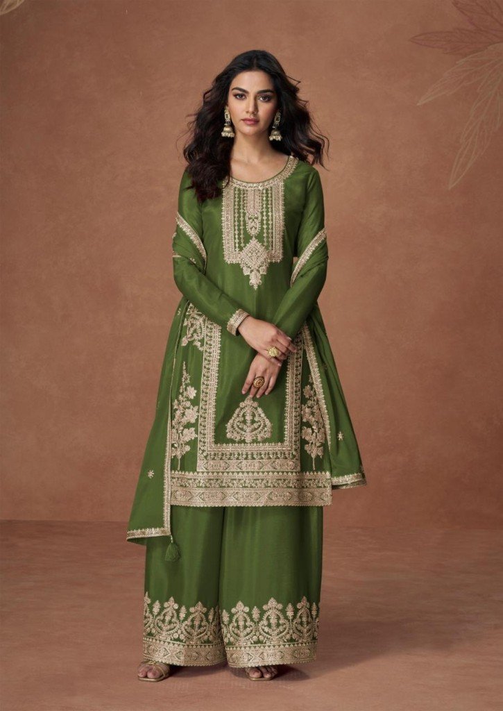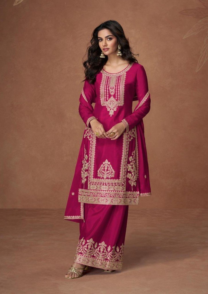 Aashirwad Creation Anupama Premium Chinnon Top Chinnon Silk Palazzo Suit And Chinnon Dupatta Wholesale