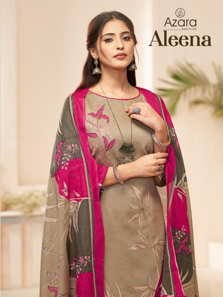 Aleena by Azara, a luxurious catalogue featuring Pure Jaam Cotton top with elegant designs. This designer dress material collection blends traditional charm with modern finesse, perfect for festive and casual wear at an affordable rate.