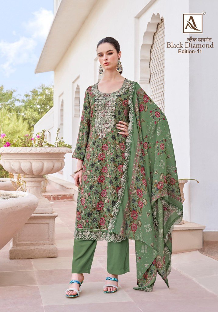 Alok Balck Daimond 11 Unstitched Suit Embroidered Reyon Top Solid Bottom And Viscose Cotton Dupatta Wholesale