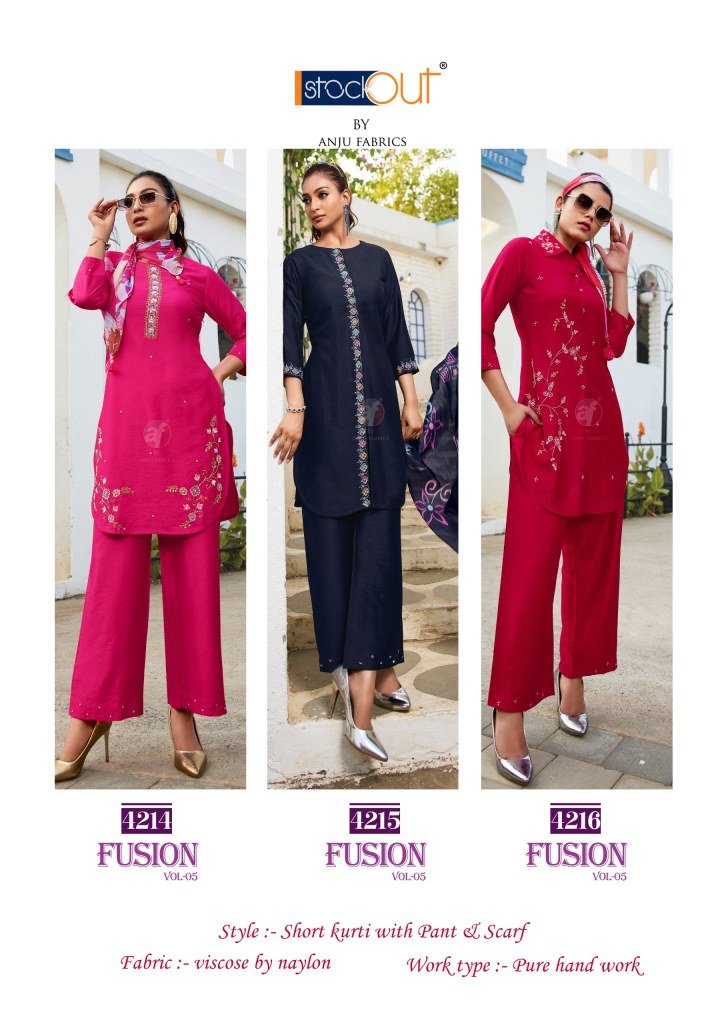Anju Fabrics Fusion Vol 5 Designer Kurti with Palazzo And Chiffon Scarf Viscose Nylon Handwork Detailing Wholesale