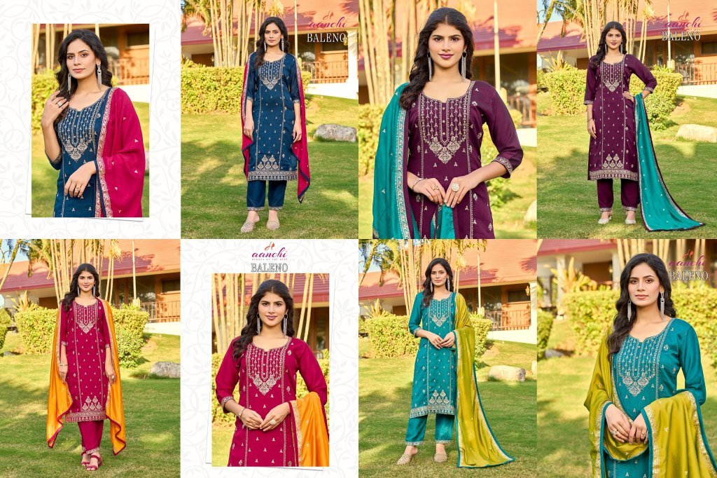 The Baleno by Aanchi Vichitra Silk 3 piece suit featuring a straight-cut top, bottom, and dupatta. Elegant design and premium fabric now available at a low rate – perfect for festive and casual occasions.