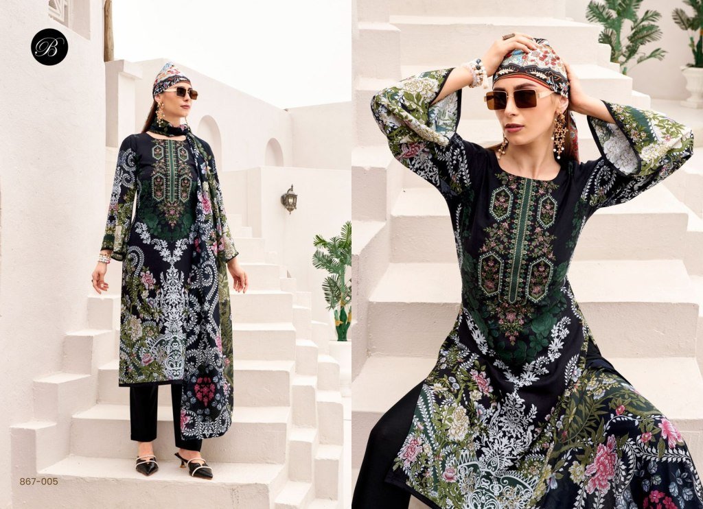 BelliZa Designer Studio Riwayat Vol 12 Unstitched Pure Viscose Rayon Top with Heavy Self Embroidery Viscose Rayon Bottom Pure Mal Mal Cotton Digital