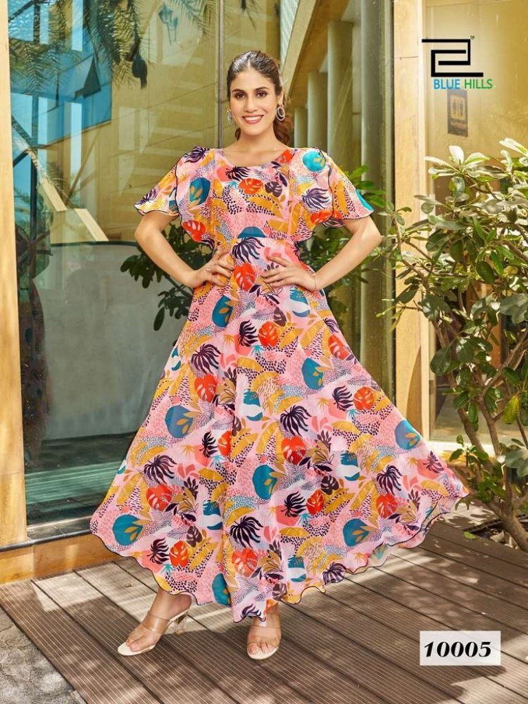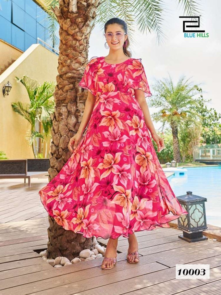 SKU : Blue Hills Big Bull Vol 10 Fox Georgette Digital Printed Long Gown Style Kurti Design wholesaler