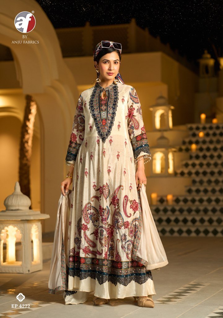 Anju Fabrics Dedaar Collection, Natural Crepe Designer Gown, Stone Work Anarkali Gown, Pure Chinon Dupatta Suit, Premium Party Wear Gown, Anju Fabrics Catalog 2026, Luxury Ethnic Gowns under 3000, Wedding Wear Crepe Gown, Long Designer Gown with Dupatta