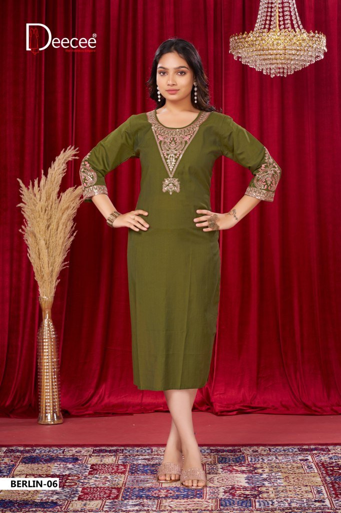 DeeCee Berlin Vatican Paleion Fabric Flared Long State Pattern Kurti with Attached Inner Premium Computer Embroidered Yoke Design Wholesale