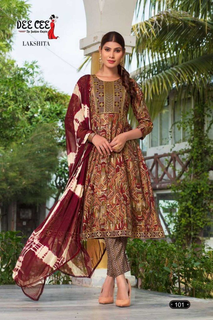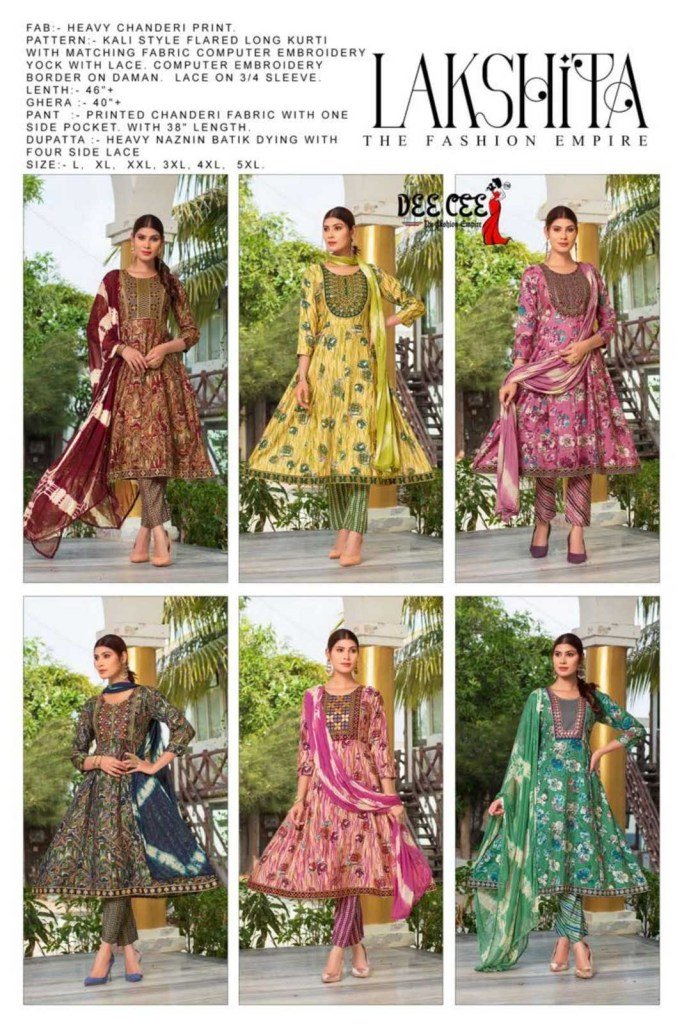 DeeCee Lakshita Premium Chanderi Kali Kurti Set Embroidered Yoke, Printed Pant with Pocket And Batik Dyed Dupatta Wholesale
