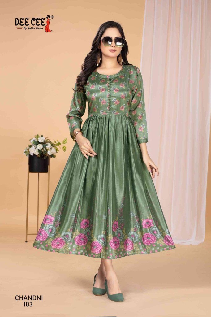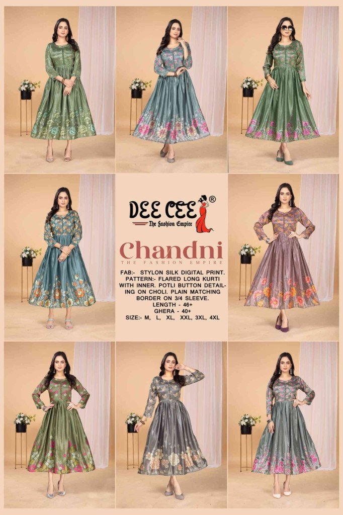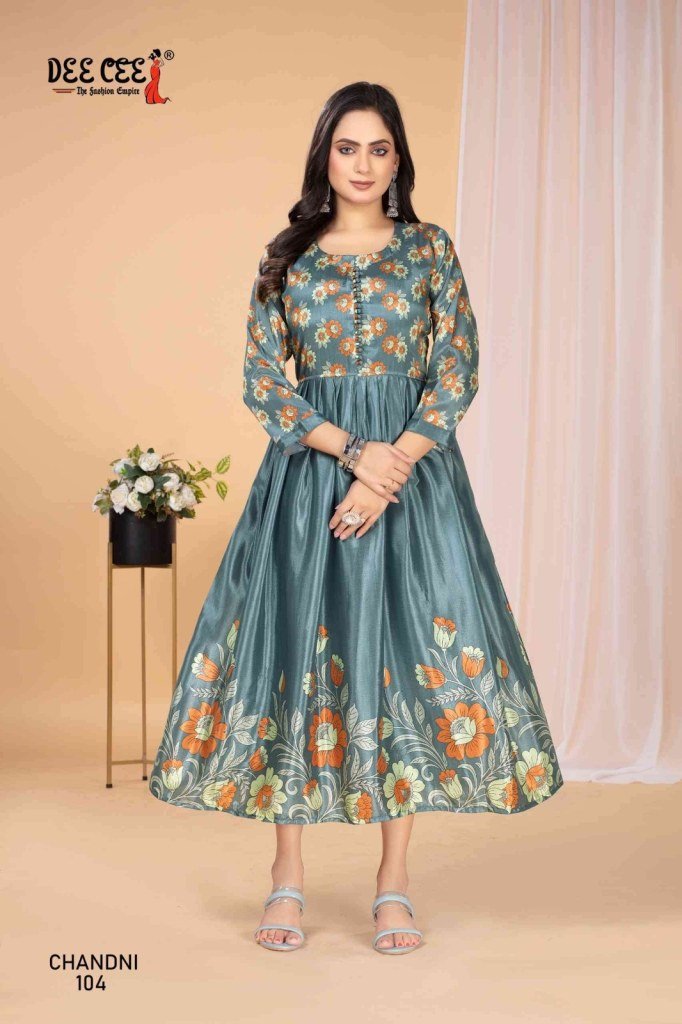 Deecee Chandni Stylon Silk Digital Print Flared Long Kurti with Inner And Potli Button Detailing Wholesale