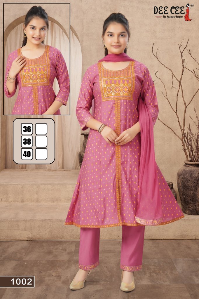 Deecee Parnita Roman Silk Flared Kurti with Embroidered Center And Screen Print Pant and Nanzin Daying Screen Print Border Dupatta Wholesale