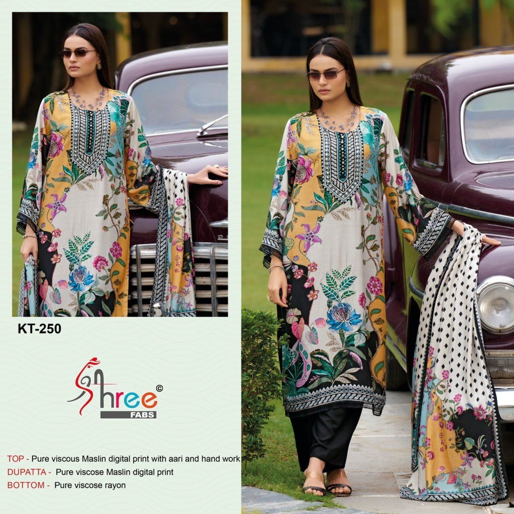 Elegant Shree Fab KT 250 Unstitched Suit Pure Viscose Maslin, Hand And Aari Work, Digital Print Dupatta Wholesale