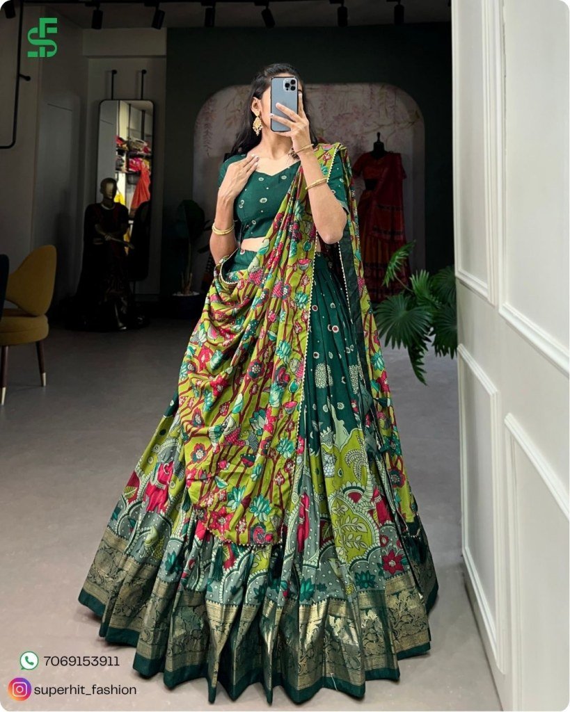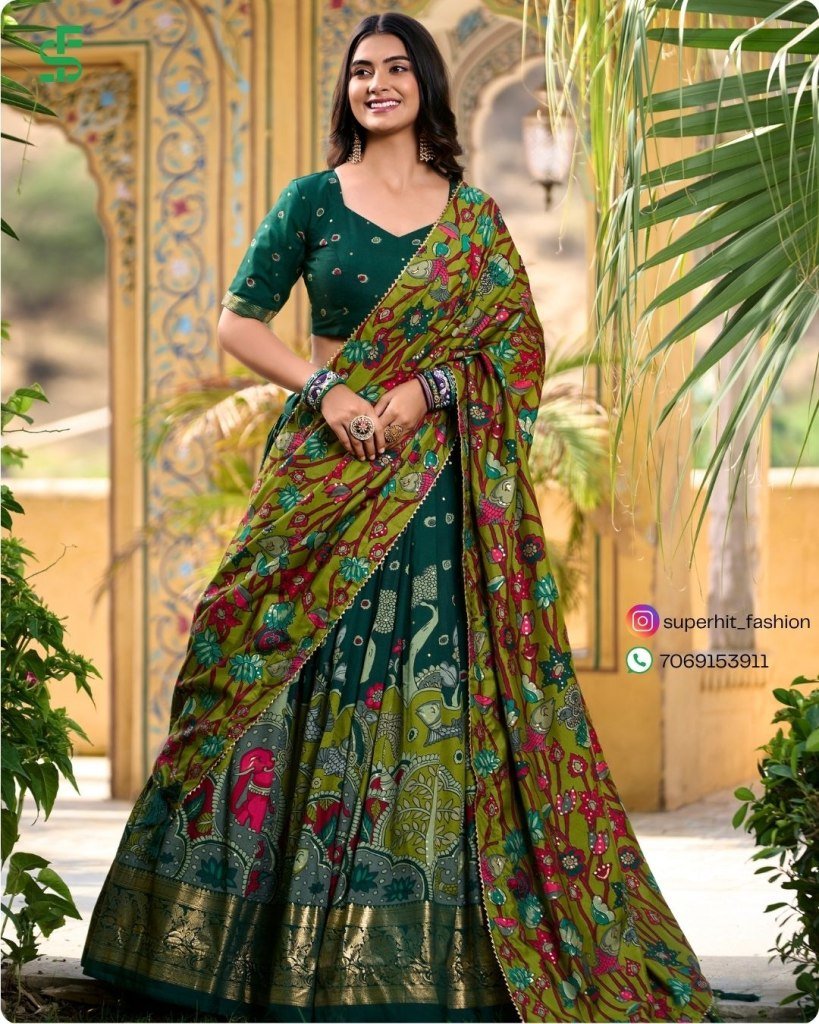 Exclusive Tussar Silk Kalamkari Lehenga Choli Set 1219 Green Colour with Shimmering Foil and Gotta Patti Lace And Tassel Embellished Dupatta Wholesale