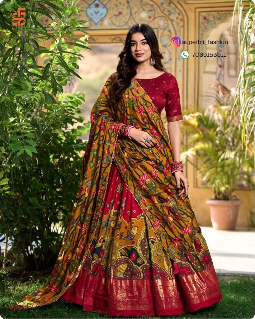 Exclusive Tussar Silk Kalamkari Lehenga Choli Set 1219Red Colour with Shimmering Foil and Gotta Patti Lace And Tassel Embellished Dupatta Wholesale