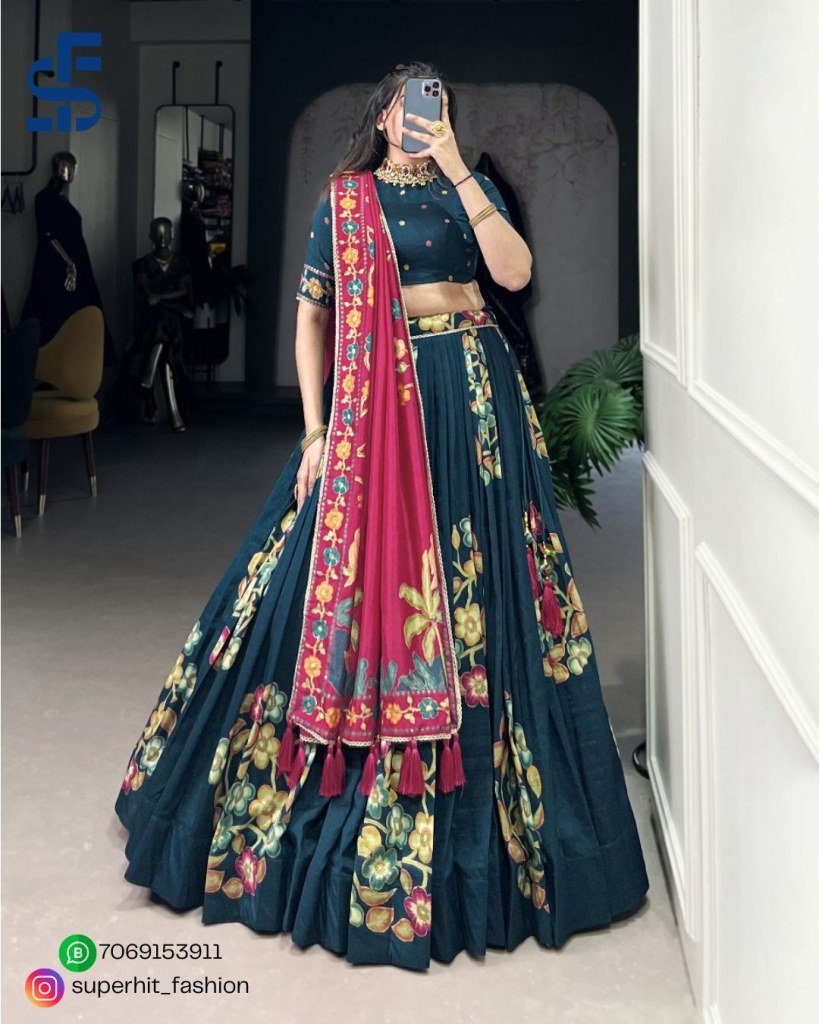 Twirl, dance, and shine bright at every celebration This Tussar silk lehenga choli set is soft, stylish, and full of festive magic—perfect for making memories