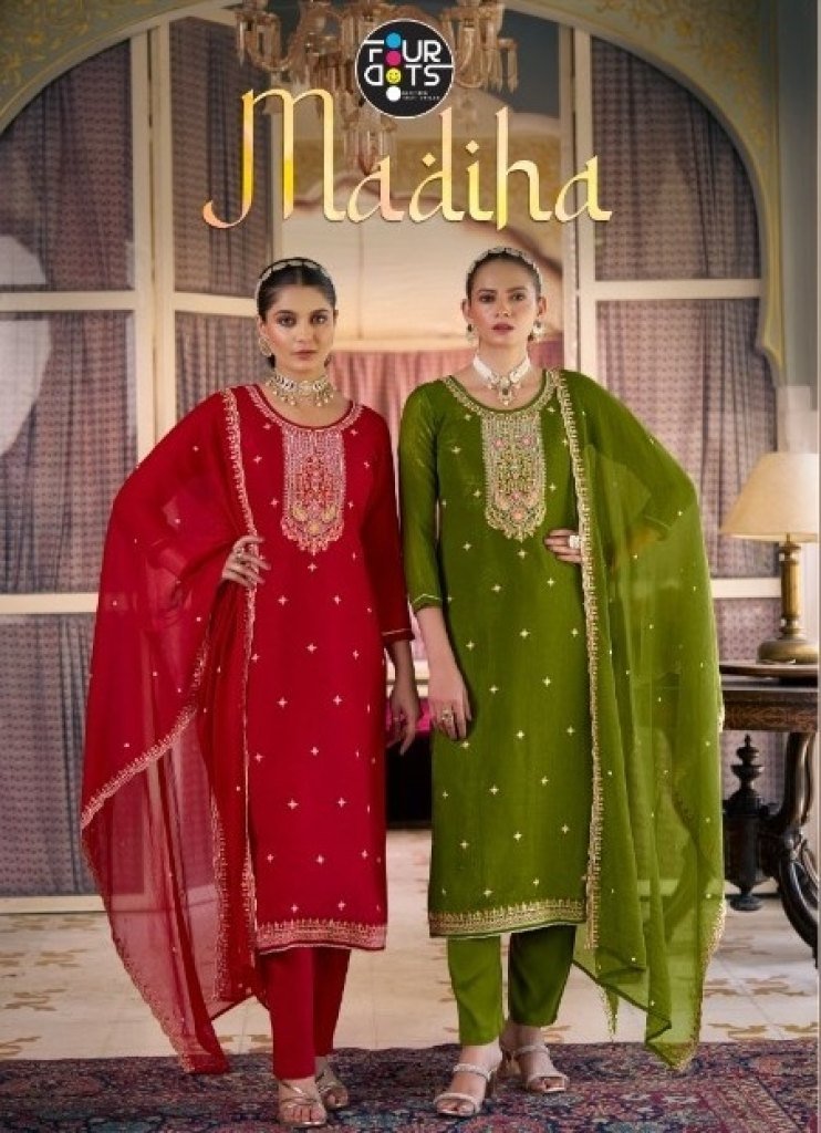 Fourdots Madiha Crush Silk Unstitched Top with Heavy Work Dull Santoon Bottom Set with Simer Najneen Heavy Work Dupatta Wholesale