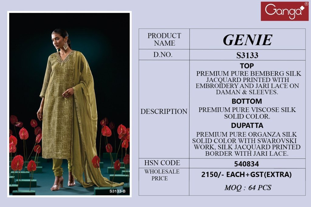 Ganga Genie 3133 Unstitched Premium Pure Bemberg Silk Jacquard Embroidered Suit with Organza Silk Dupatta And Swarovski Accents Wholesale
