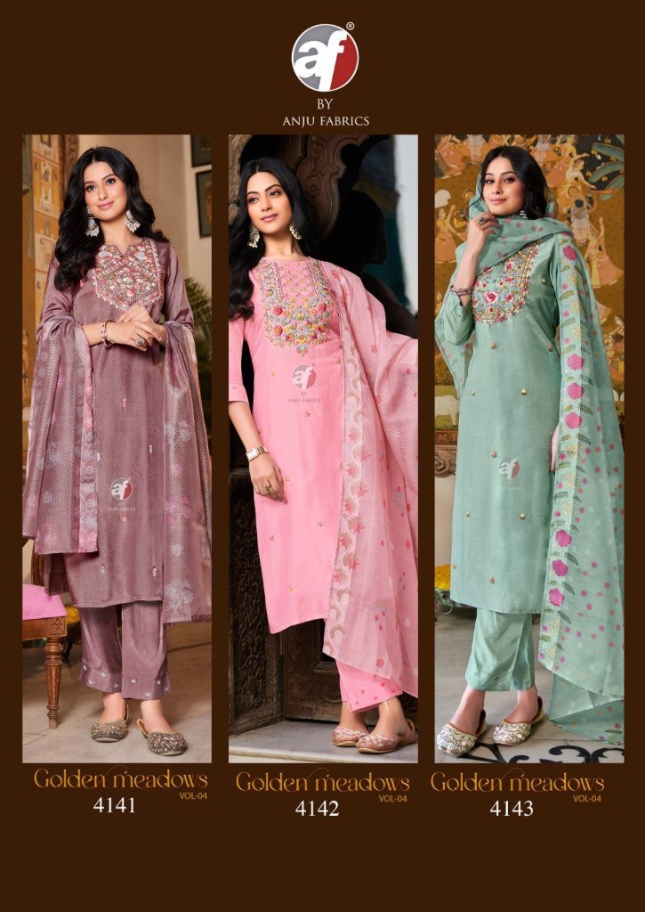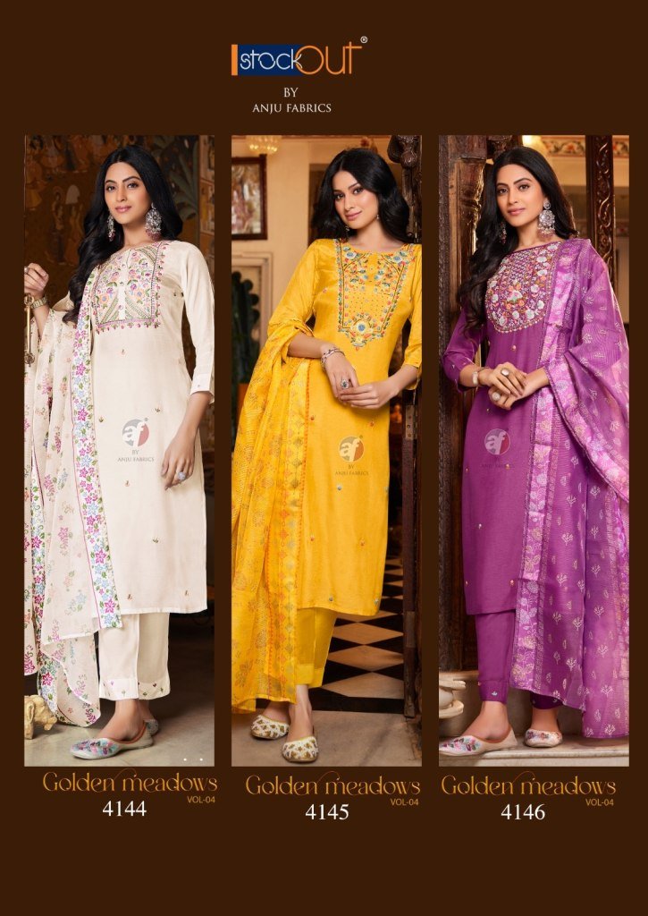 Golden Medows Vol 4 by Anju Fabric – a premium collection of pure Muslin embroidered designer readymade suits. Elegant styles, superior quality & affordable rates. Perfect for festive and ethnic wear.