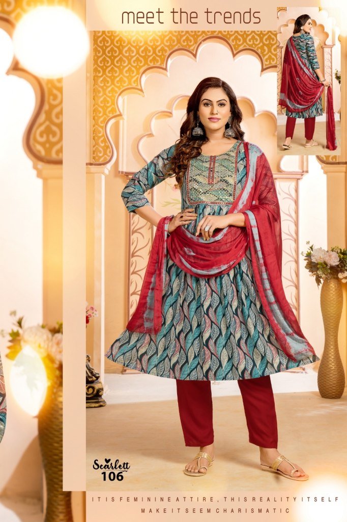 H dot Hirwa by Scarlett heavy reyon foil printed naira cut embroidered readymade suit catalogue, buy this Naira Cut Festive wear Kurtis with Heavy Embroidery Work kurti with Heavy Rayon Plain pant and Heavy Nazneen dupatta catalogue at affordable rate.