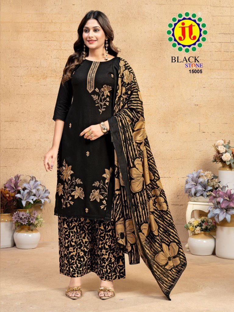 JAMATMAL TILOKCHAND Black Stone Premium Work Suits Exclusive 5 Designs Rayon Fabric with Embroidery and Lace wholesale radymade suits