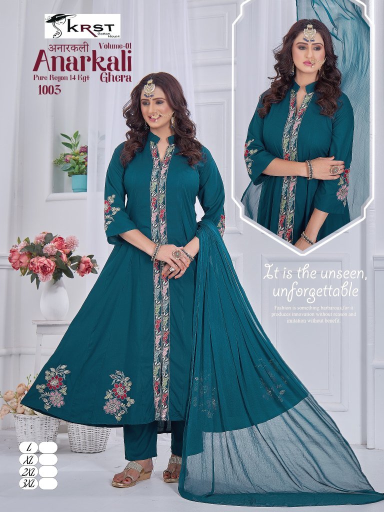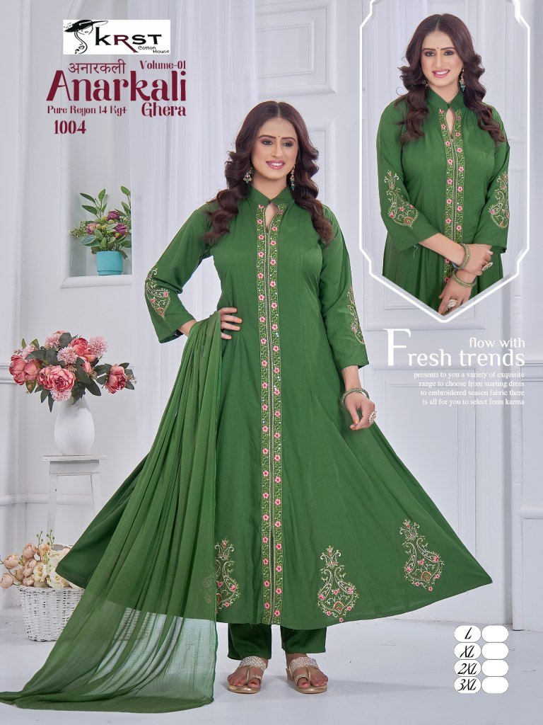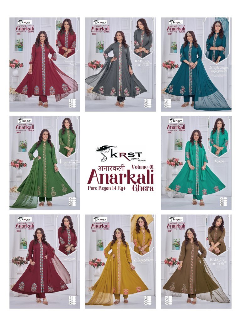 KRST Anarkali Vol 1 Pure Rayon 55 Ghera 50 Long Kurta with Special Round Kali And Designer Sleeve Work, New Rounded Pant Set Astin Work Wholesale
