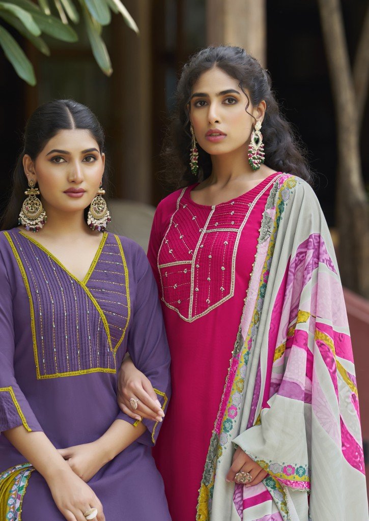 Elegance with Karissa by Vidisha Vol 9, featuring premium Liva-tagged top, bottom, and dupatta sets. Shop this graceful readymade suit collection at an affordable price now.