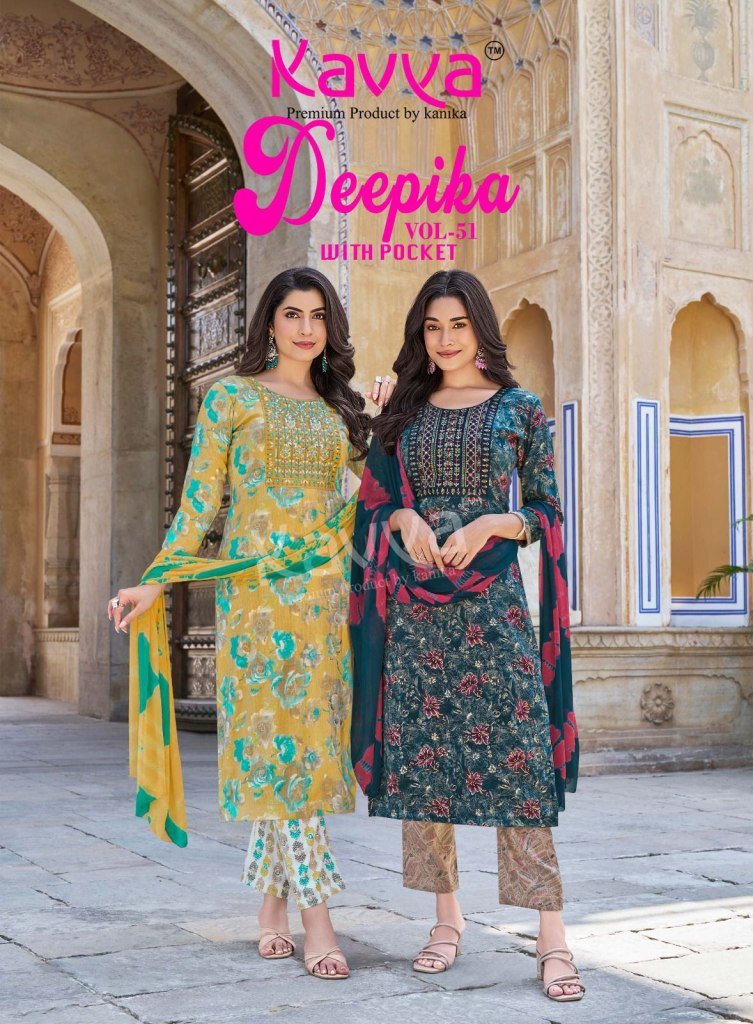 Kavya Deepika Vol 51 Embroidered Straight Kurti Set with Pocket Pant And Nazleen Dupatta Wholesale Ethnic Collection