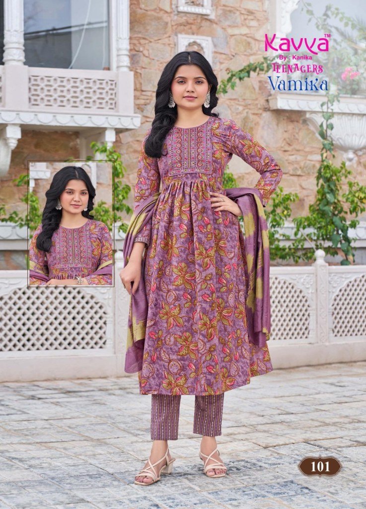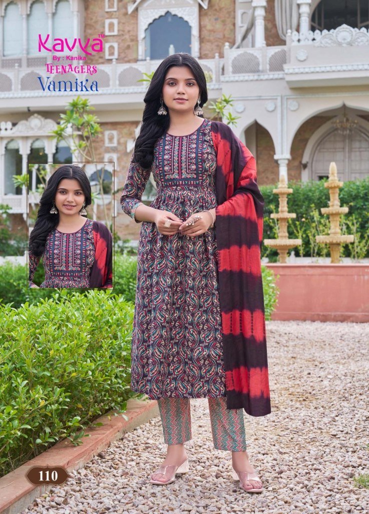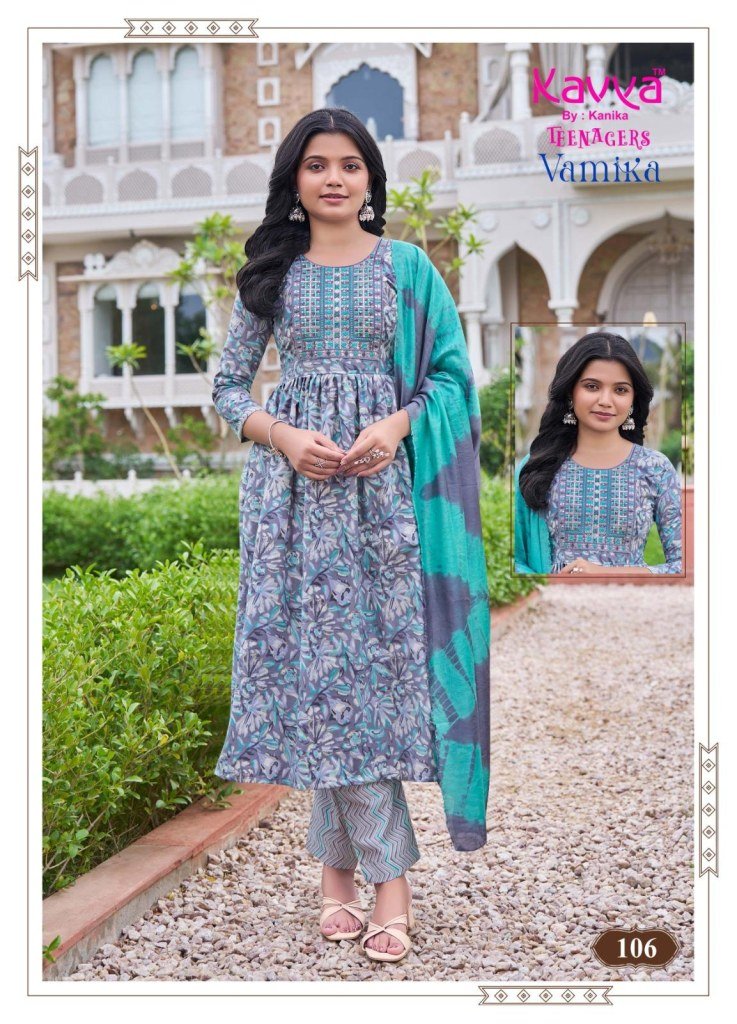 Kavya Vamika Vol 1 Teenagers Umbrella Cut Poly Viscose Suit Set with Foil Print Pant And Chanderi Cotton Dupatta