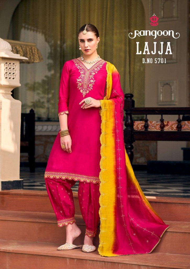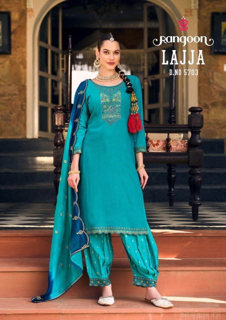 Lajja by Rangoon Muslin Fancy Embroidered Top bottom with Dupatta catalogue, Explore the elegant Lajja by Rangoon collection featuring muslin fancy embroidered top, bottom, and dupatta. Shop this stylish and trendy readymade suit catalogue at an affordable rate.