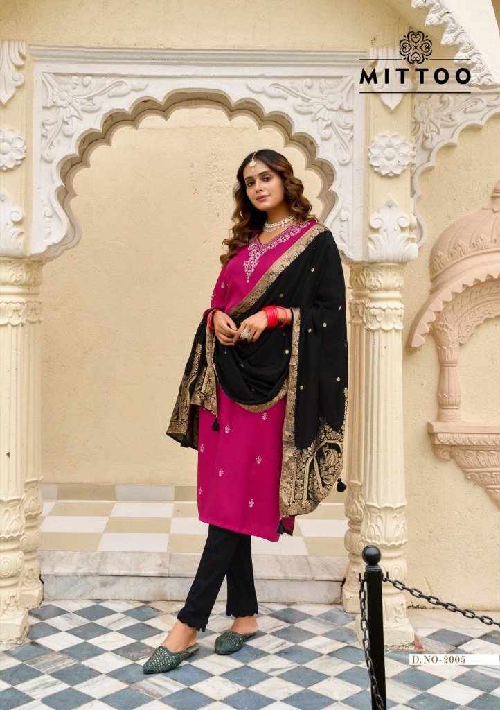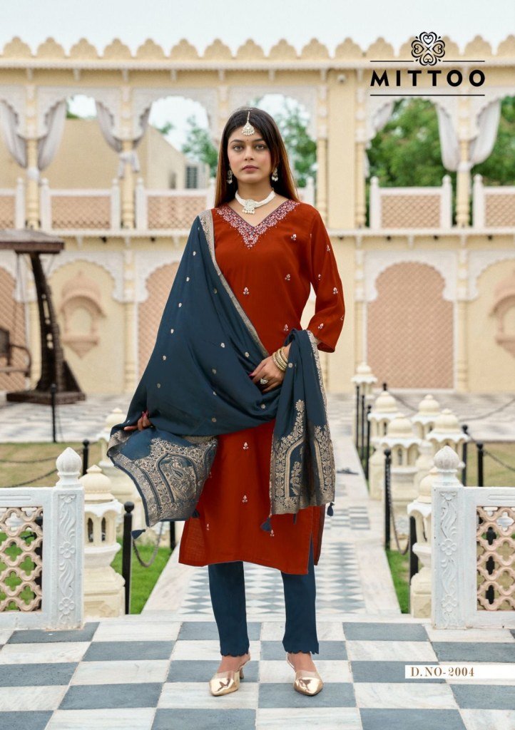 Mittoo Alankar Design 6 Viscose Weaving Kurti Set with Hand Threadwork Cotton Lycra Bottom And Pure Muslin Jacquard Dupatta Wholesale