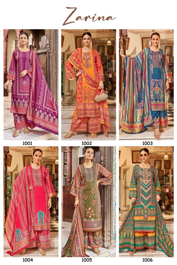 Mukesh Zarina Pure Crape Silk Digital Print Suit Set with Mirror Work Top Palazzo And Dupatta Wholesale