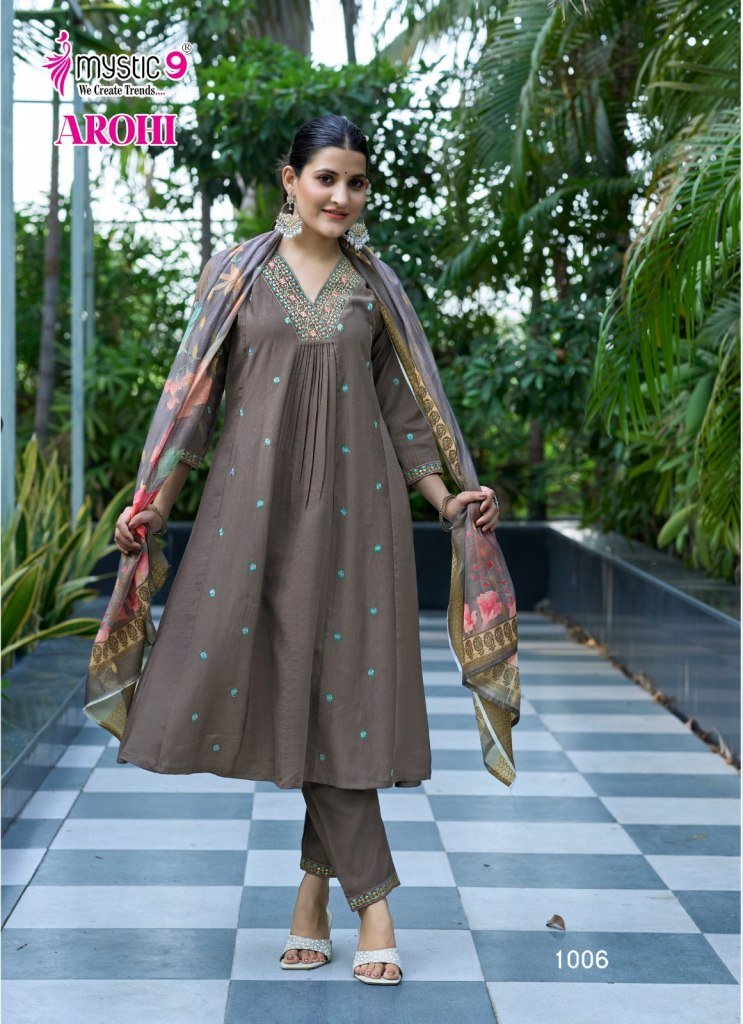 Mystic 9 Arohi Vol 1 Premium Vertican Dobby Princess Cut Suit Set with Embroidery Chanderi Dupatta Wholesale