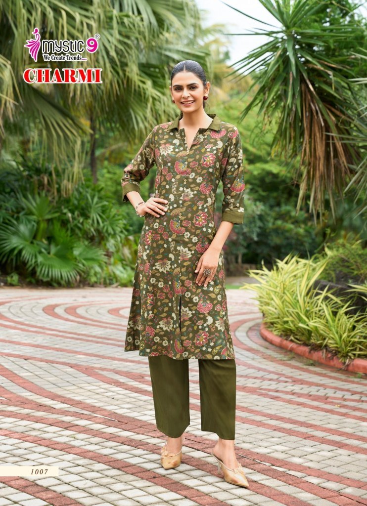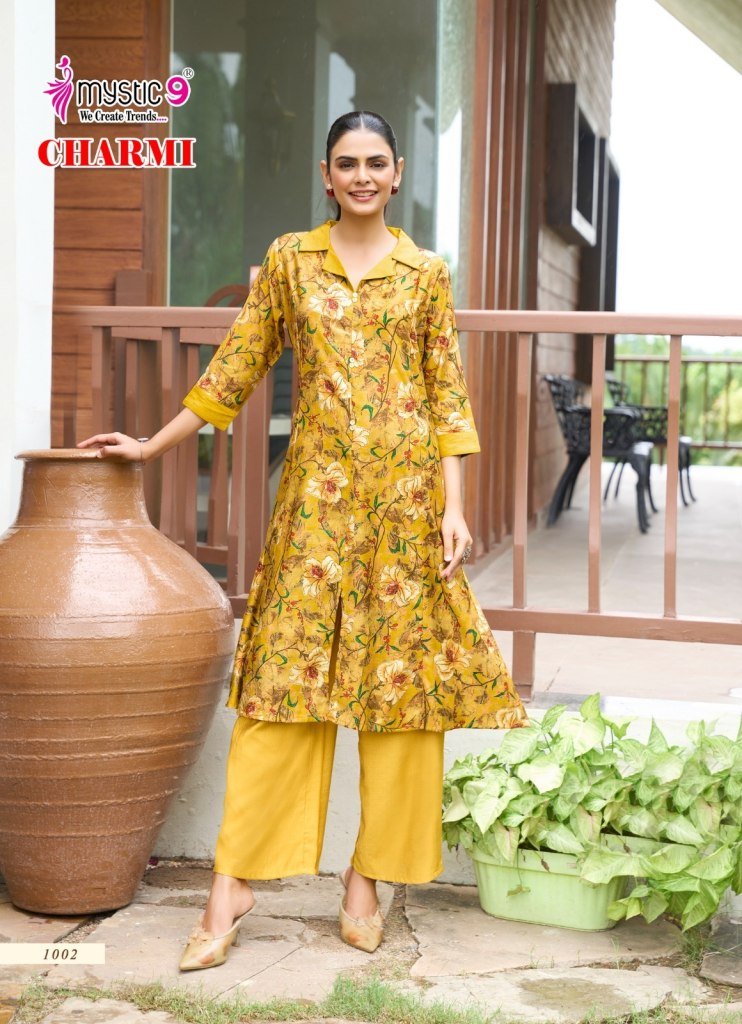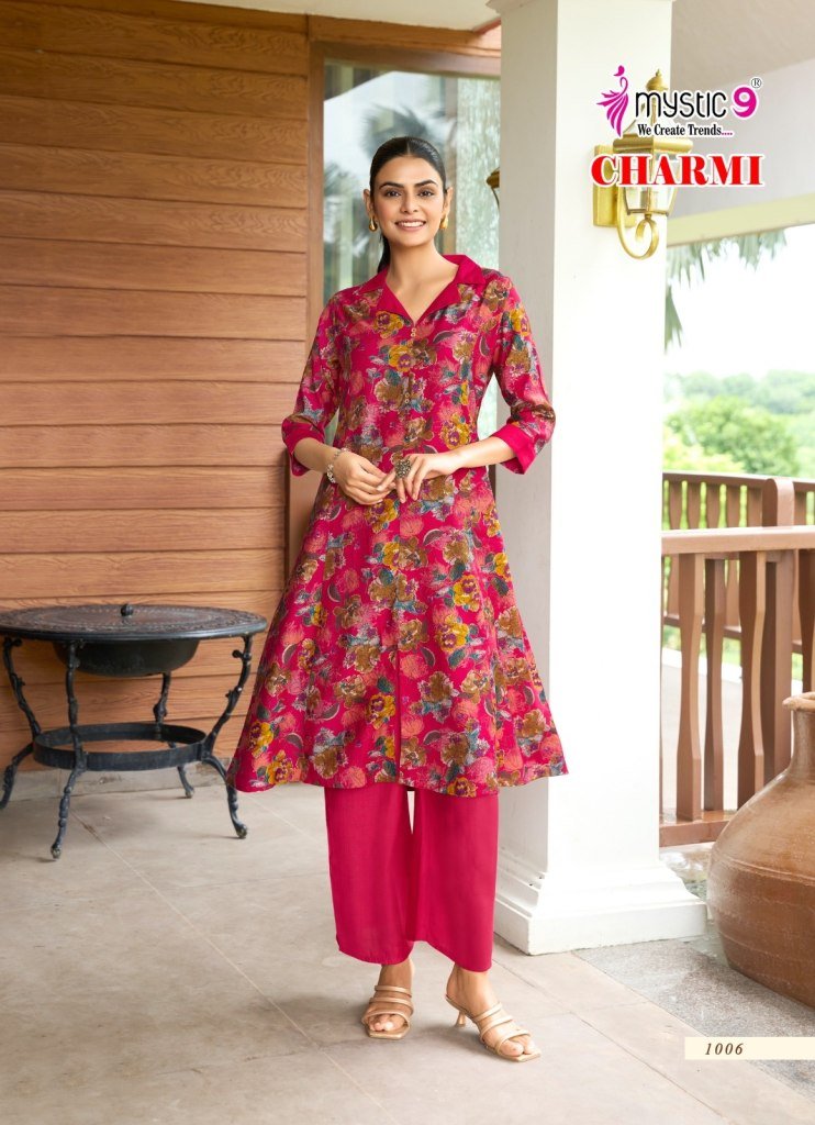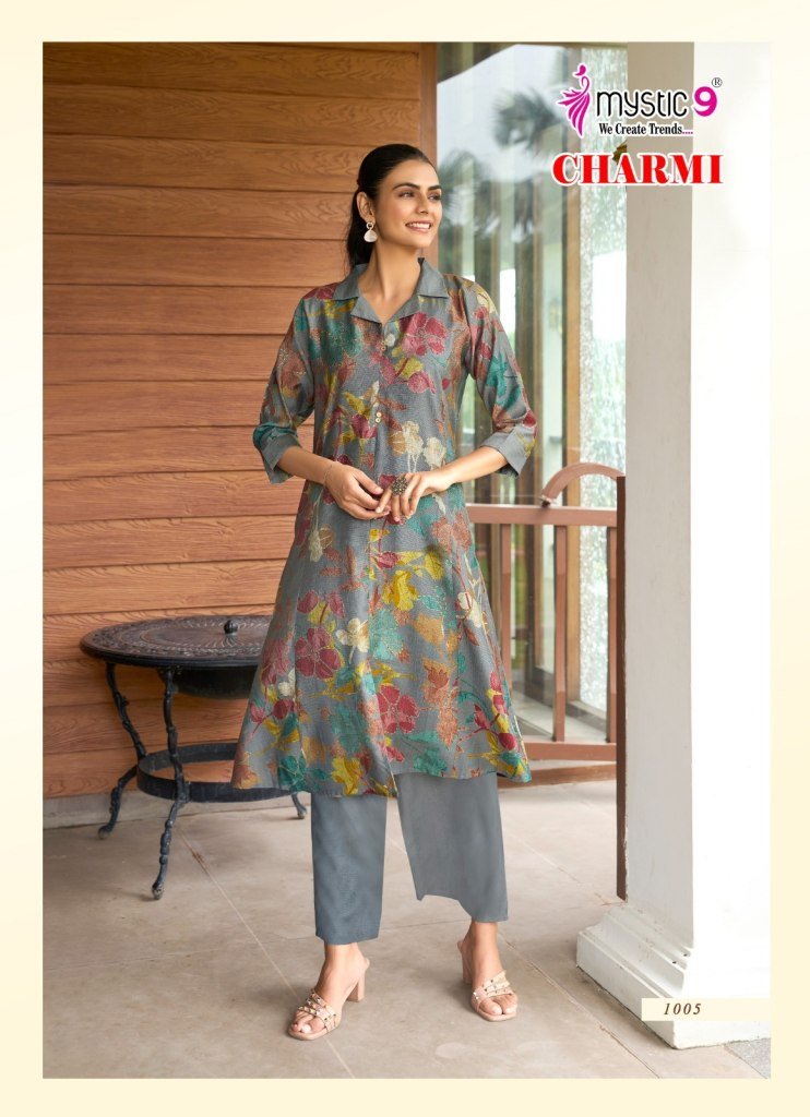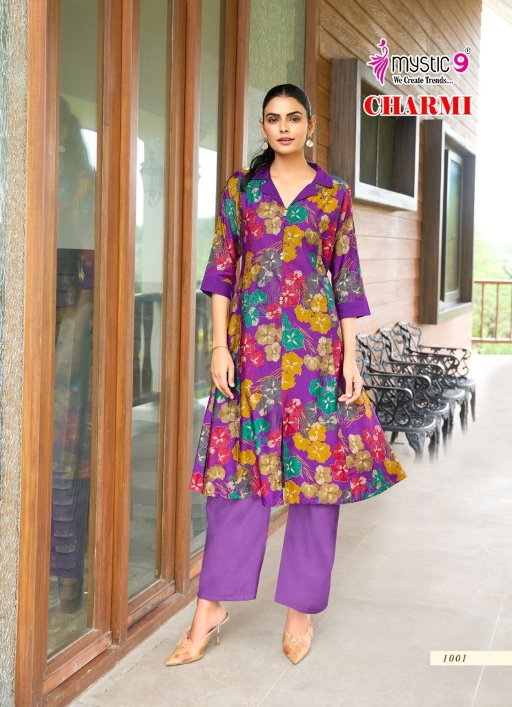 Mystic 9 Charmi Vol 1 Premium Heavy Vertican Foil Print Princess Cut Co ord Set Top with Sleeves Lock Spread Collar And Exclusive Pocket and Straigh