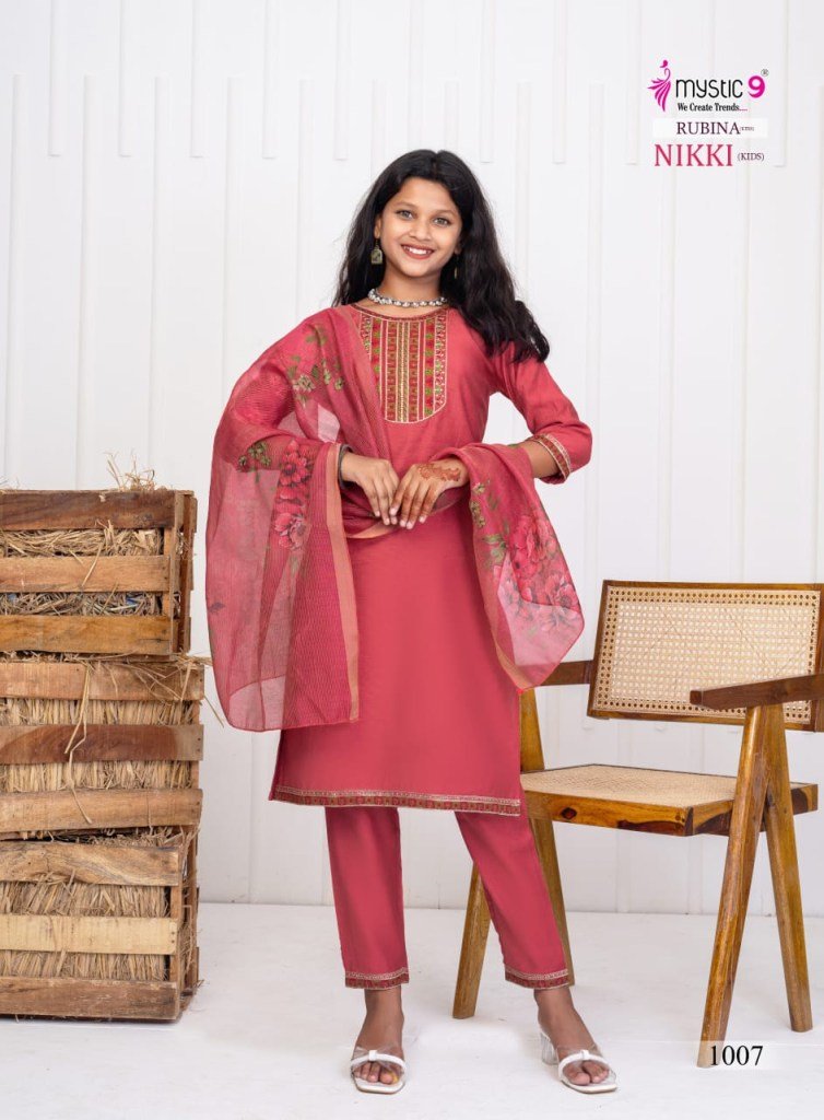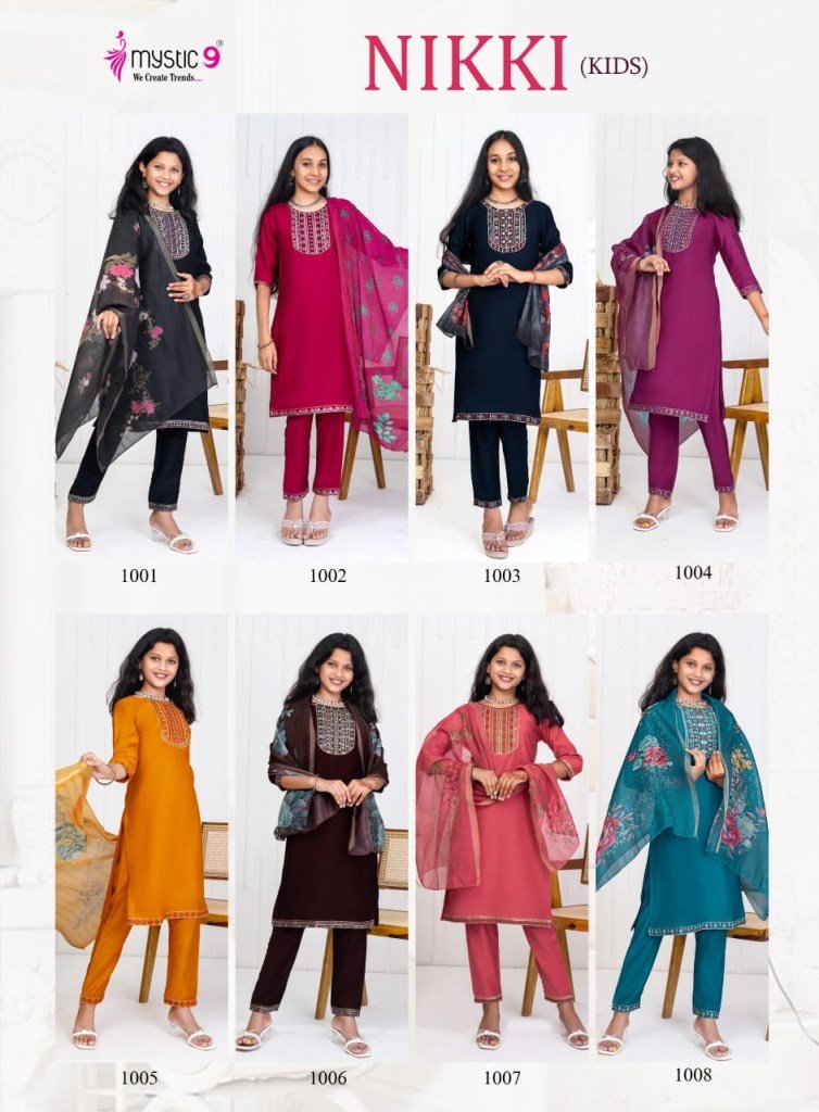 Mystic 9 Nikki Kids Vol 1 Premium Dyed Vertican Straight Cut Set with Embroidered Top And Digital Chanderi Dupatta Wholesale