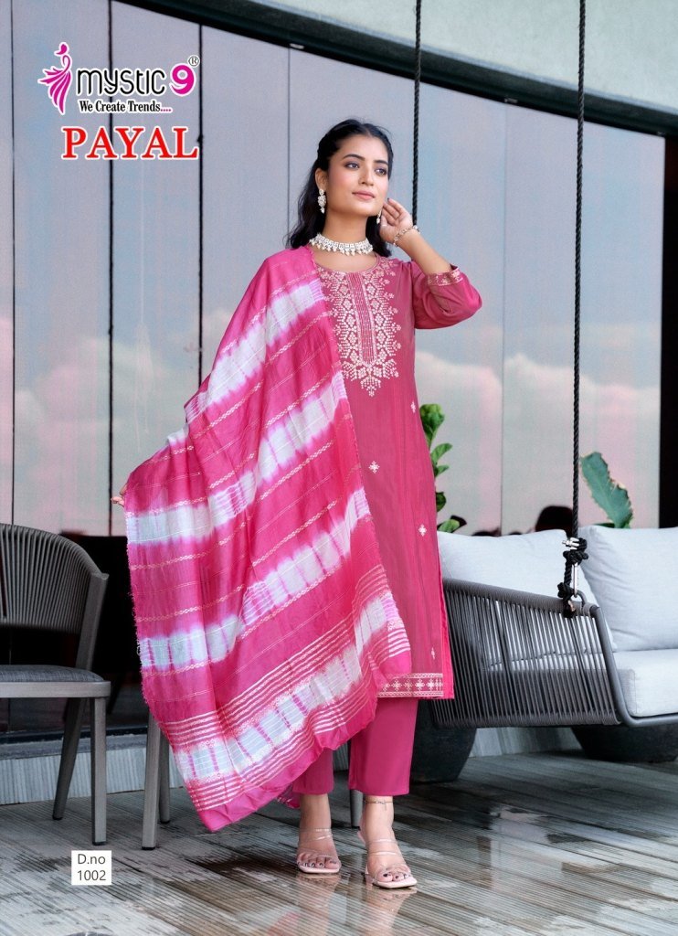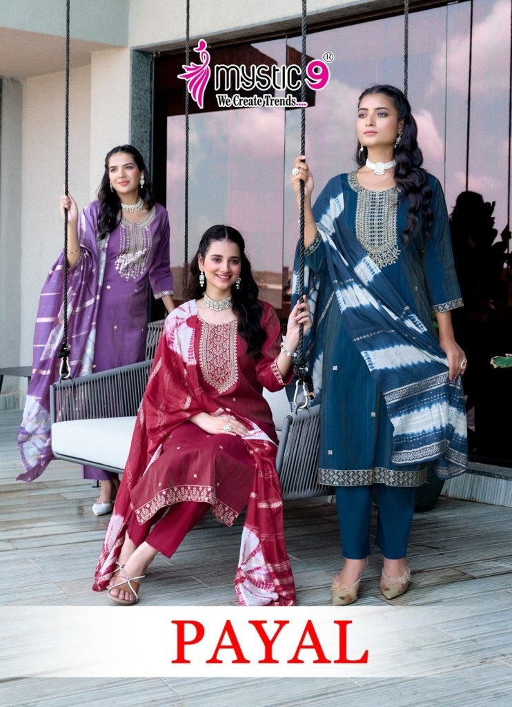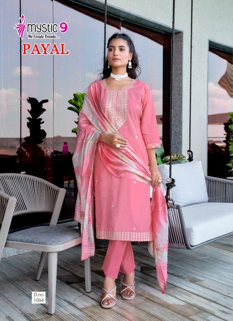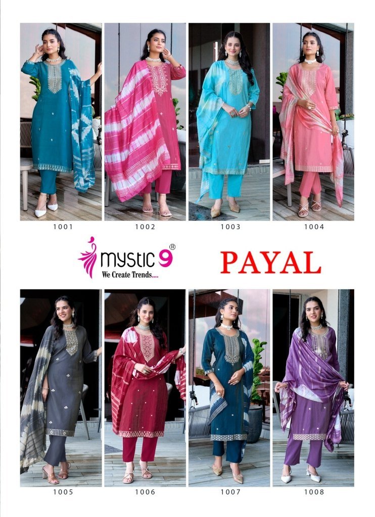 Mystic 9 Payal Vol 1 Premium Vertican Shimmer Embroidered Kurta Pant Set And Chanderi Jacquard Tie Dye Dupatta Wholesale