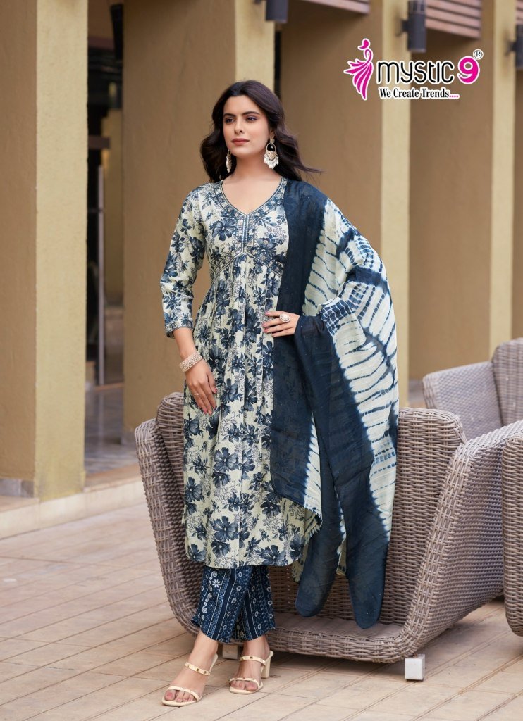 Mystic 9 Pooja Vol 10 Premium Rayon Foil Print Aaliya Cut Suit Set with Embroidery Pant And Chanderi Dupatta wholesale