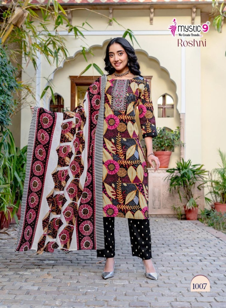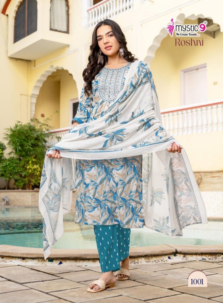 Comfortable and elegant, the Roshni Vol 1 Kurti Set by Mystic 9 is made from premium cambric cotton with embroidery and inner lining, paired with straight pants and a printed dupatta—perfect for daily and office wear.
