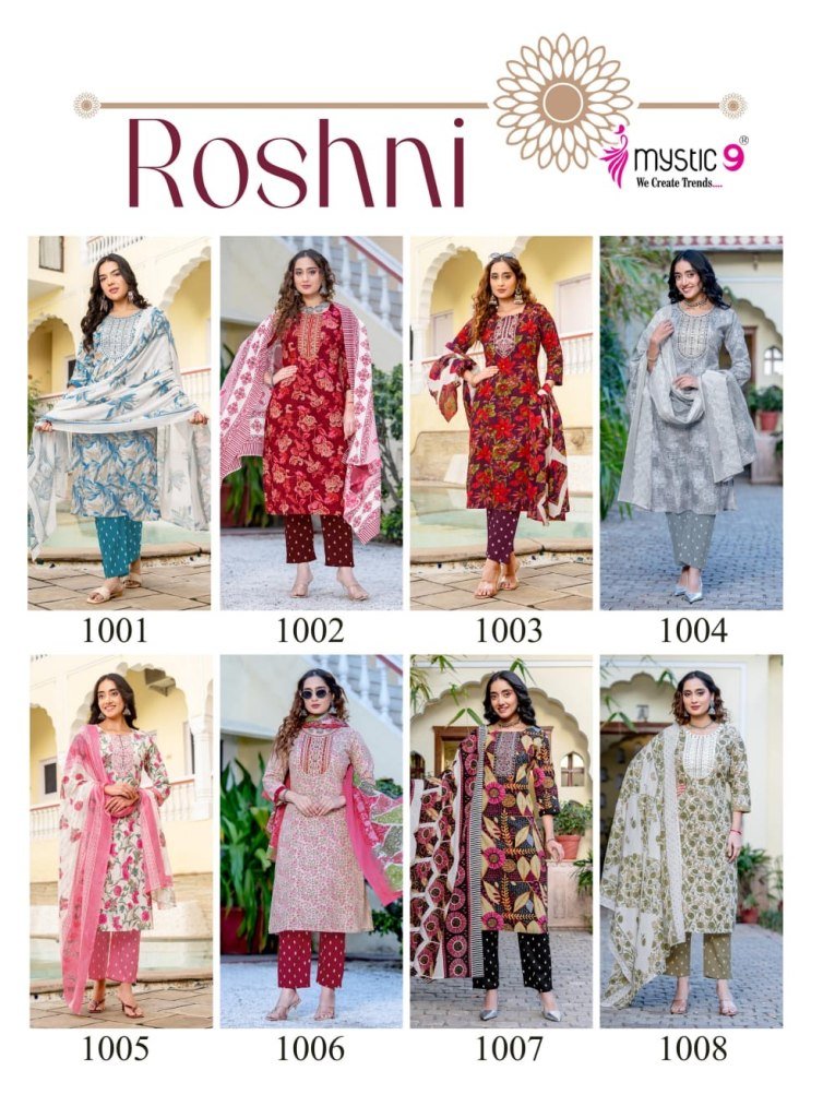 SKU : mystic 9 roshni vol 1, cambric cotton kurti set, cotton kurti pant dupatta set, embroidered cotton k
